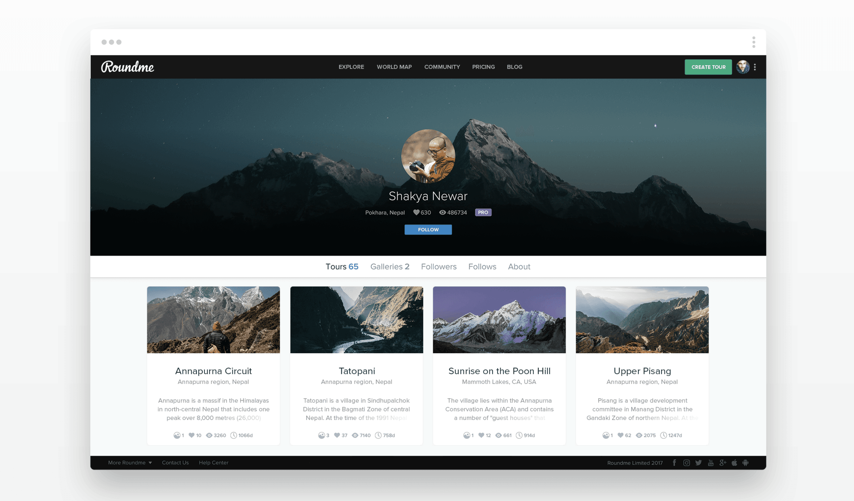Roundme profile acts like a professional portfolio for panoramic photographers, architects, designers and other immersive content creators. Tours can be easily organized in dedicated galleries with customizable access rights.